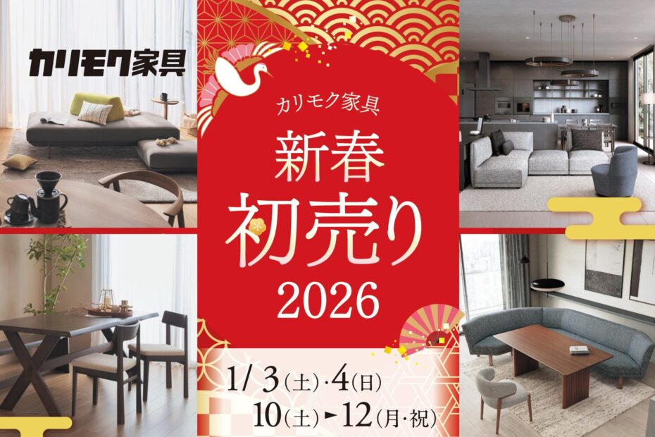 カリモク家具多摩ショールームでは、2026年1月3日(土)・4日(日)、10日(土)・11日(日)・12日(月・祝)まで「新春初売り2026」を開催いたします。 新年を楽しくスタート、生活空間を快適にするコーディネートを… 続きを読む »カリモク家具 新春初売り2026