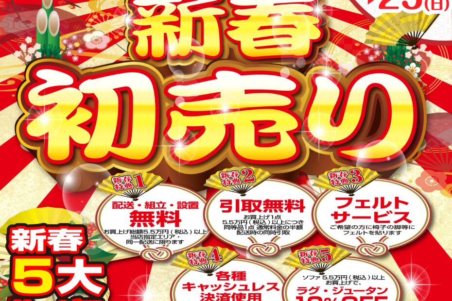 八坂家具では2026年新春初売りセールを開催します。 ソファ、ダイニングテーブル・チェア、ベッドなど、厳選したアイテムを数量限定・特別価格にてご用意しております。ガラポン抽選会や、ブランドベッドアウトレットバーゲン、冬の… 続きを読む »八坂家具 新春初売り2026